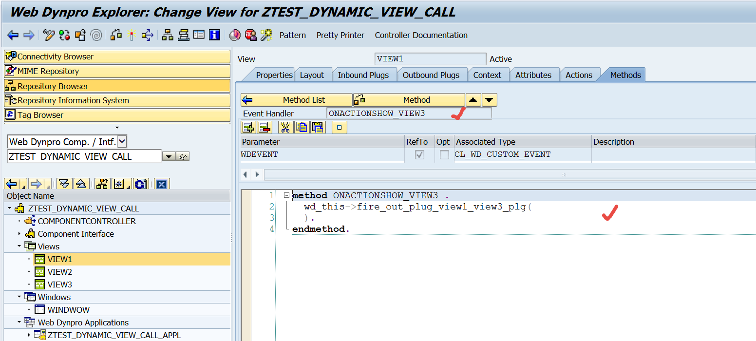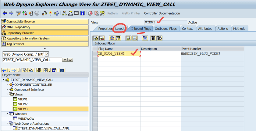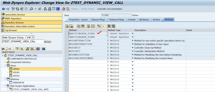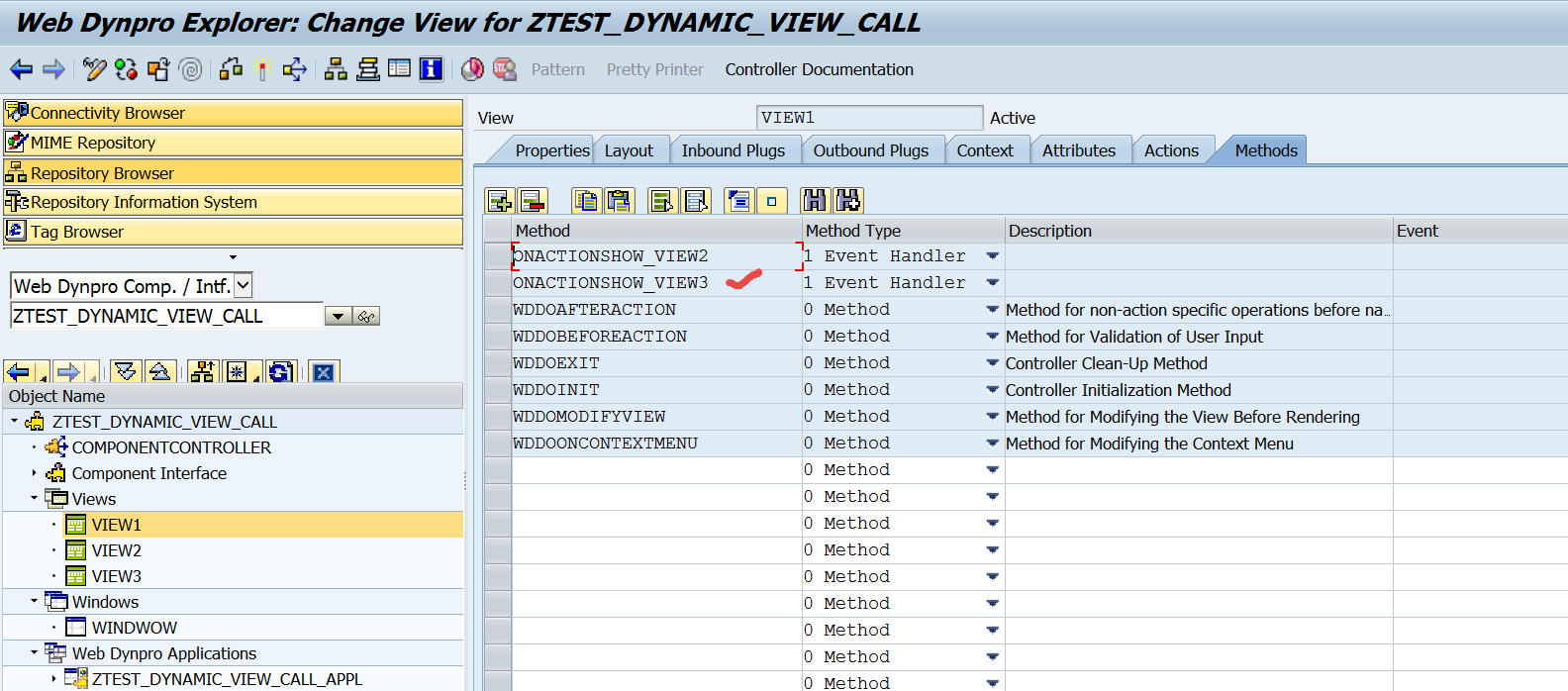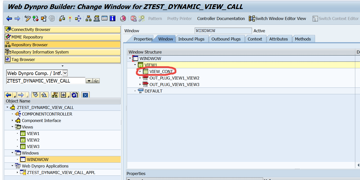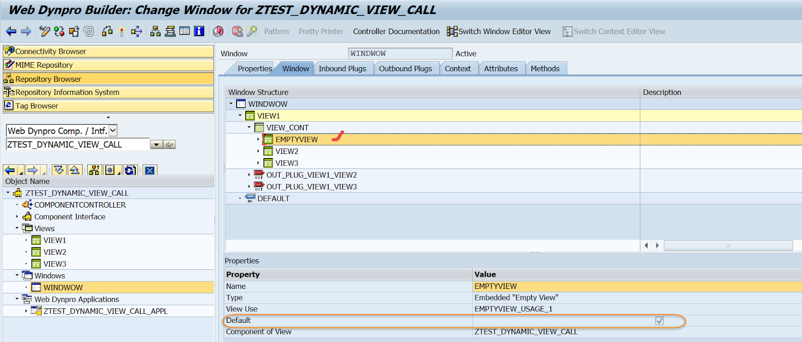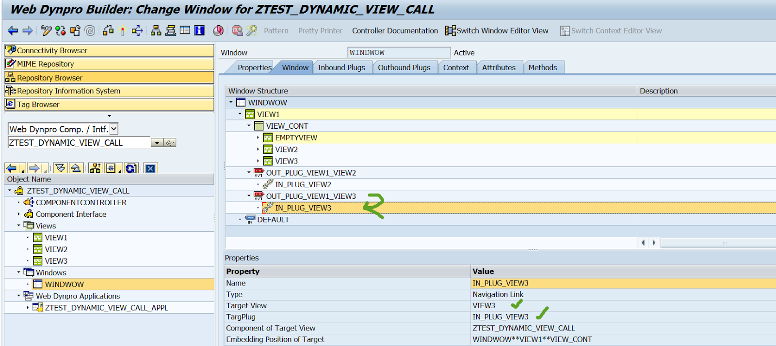 Create a web dynpro component with a window and three views as VIEW1, VIEW2 & VIEW3.