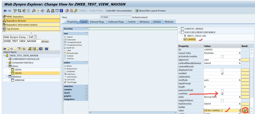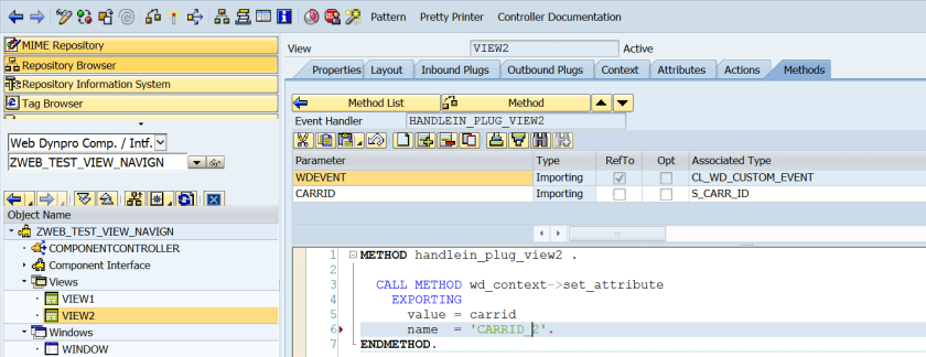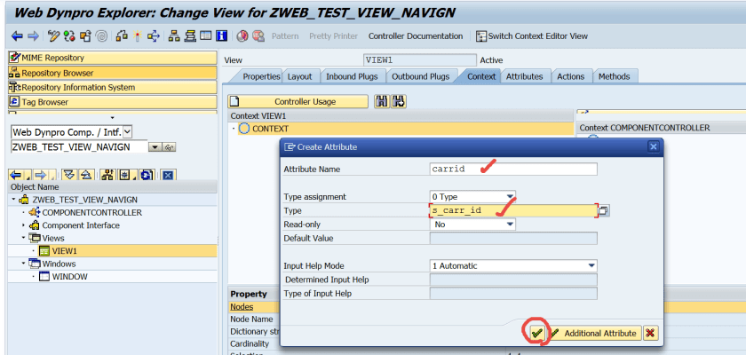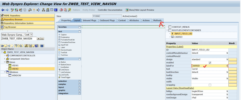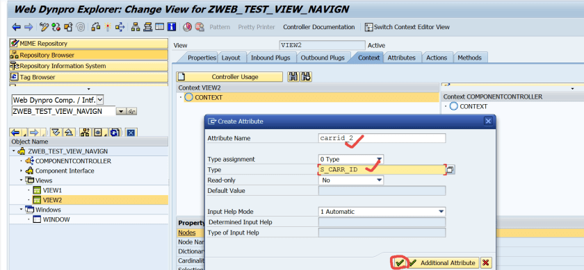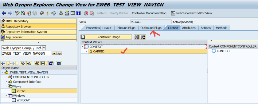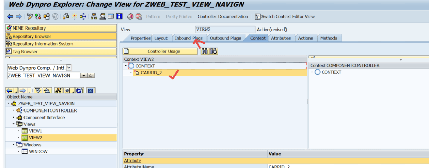 Step31. Provide carrid as the importing parameter name ans the outbound plug of the VIEW1 exports a carrid value. And set the carrid value to the context attribute so that it will appear on the layout.