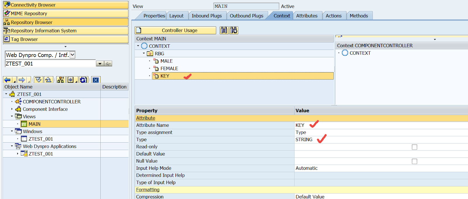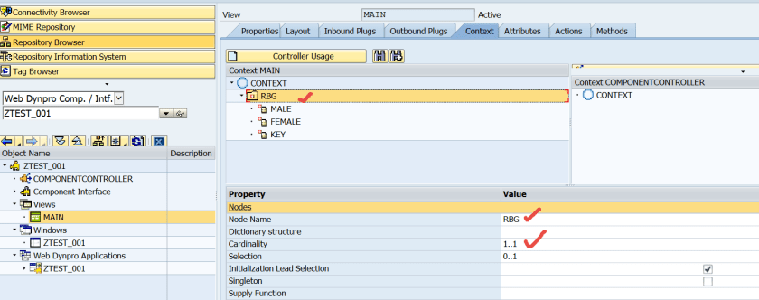 Create a web dynpro component and design the view context with a node and three attributes under that node.