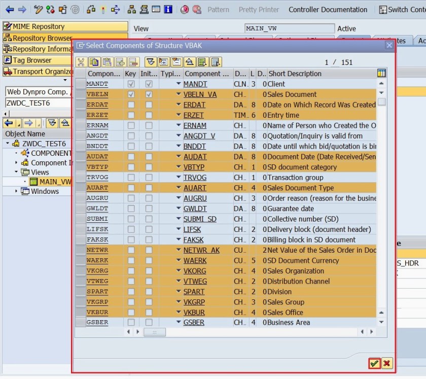Step20. The first table is created in the view and mapped to the context node SALES_HDR.