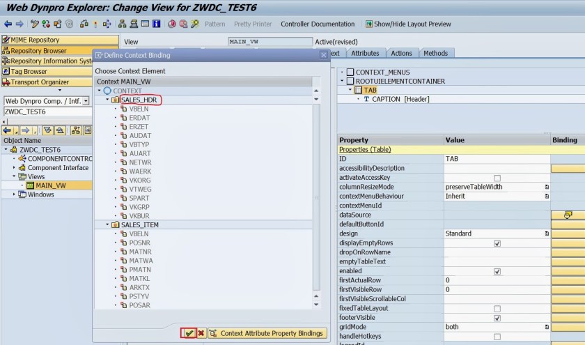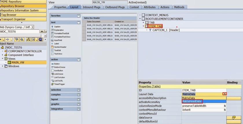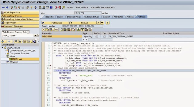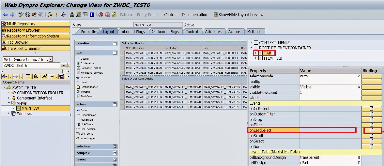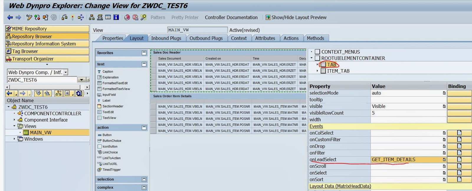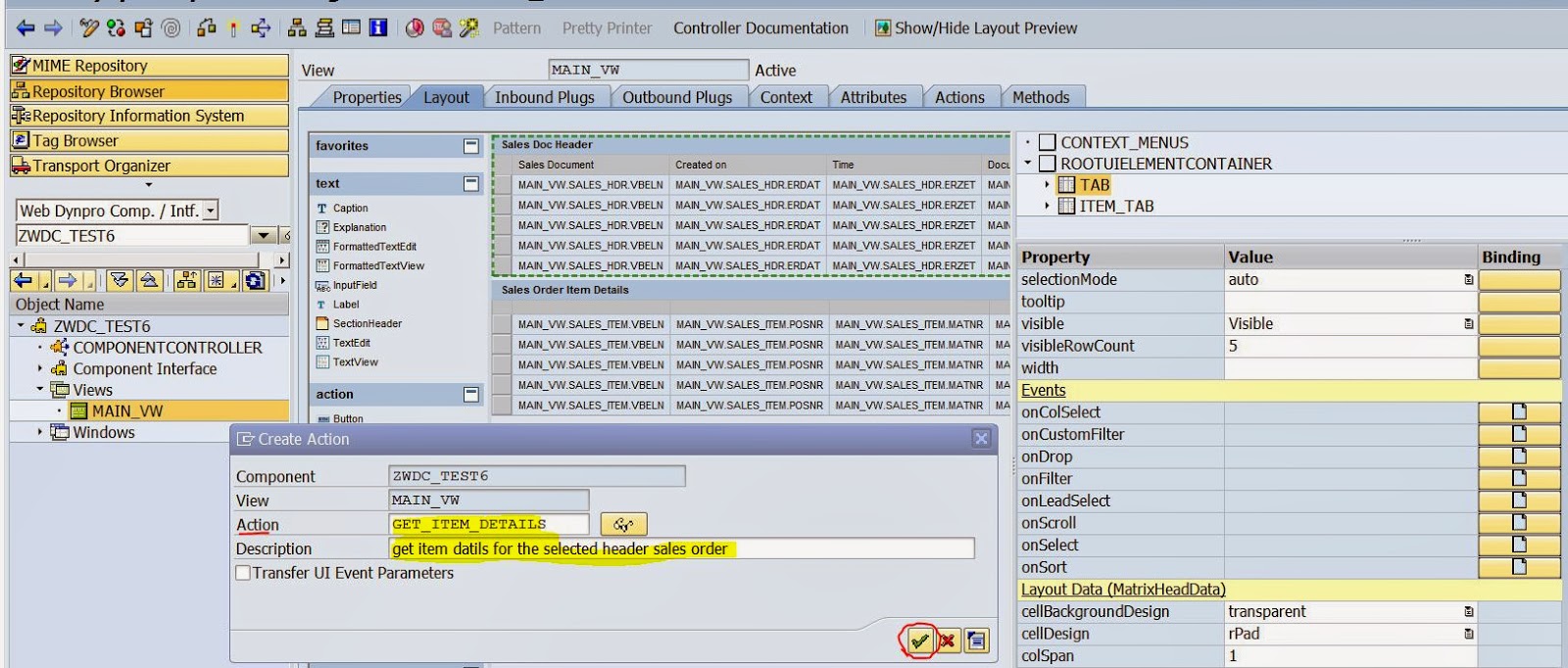 Scenario: This post is about creating two tables in a single view . One is header table and one is item table. The header table displays the sales order details and when the user selects any line in the header table the corresponding line items are displayed in the item table. The line selection in the header table uses lead selection event which triggers an action and the action handler method fills the item details in the item table.