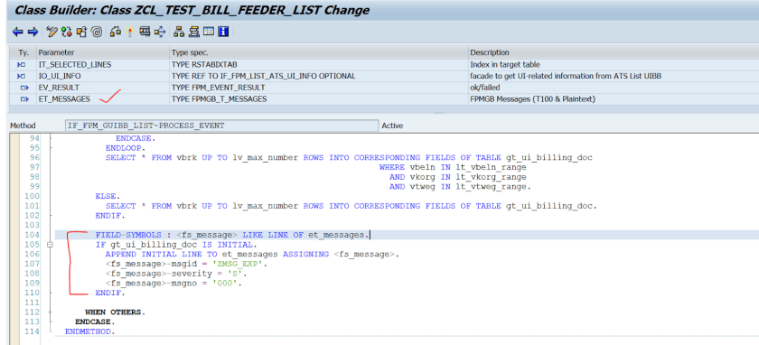 The method ZCL_TEST_BILL_FEEDER_LIST-PROCESS_EVENT having an exporting parameter ET_MESSAGES which should be filled to display any message on UI.