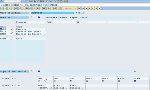 Step4. Now here the next question is how we will get to know the program associated with the pf status ‘%_00’ so that we will get to know the function code of each menu options. Here we have a option that activate the debugger and click each button and note down the sy-ucomm value of each option. But it might be time consuming. Another approach if we somehow get to know the program in which the pf status %_00 is defined then from SE41 transaction we can easily collect all the function codes of the pf status menu and buttons.