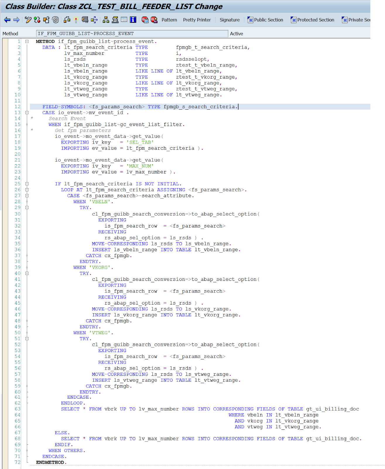 Step81. In the process event method of the list feeder class handle the event which is raised in the process event of the search uibb feeder class. Read the search criteria values and convert into range table and have a select query on the table and fill the global internal table.