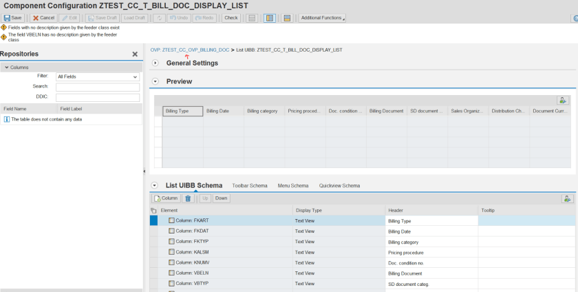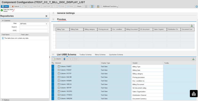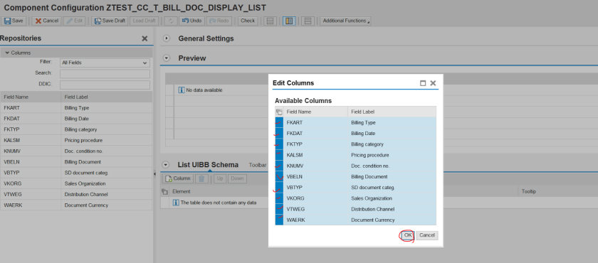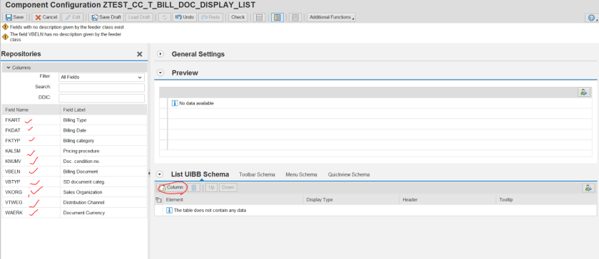 Step38. The below screen appears and here in the left side all display list fields available which is provided in the feeder class GET_DEFINITION method. Click on Column button.