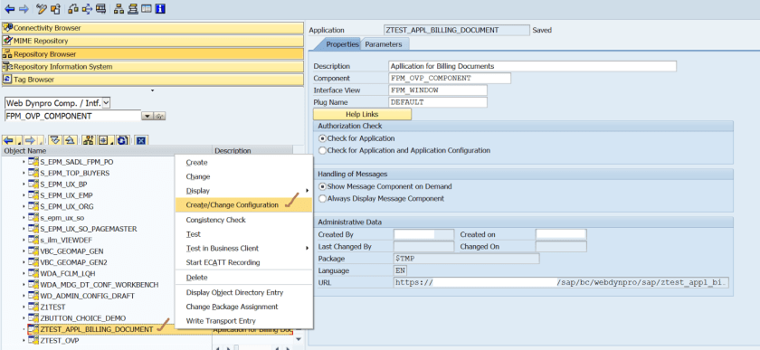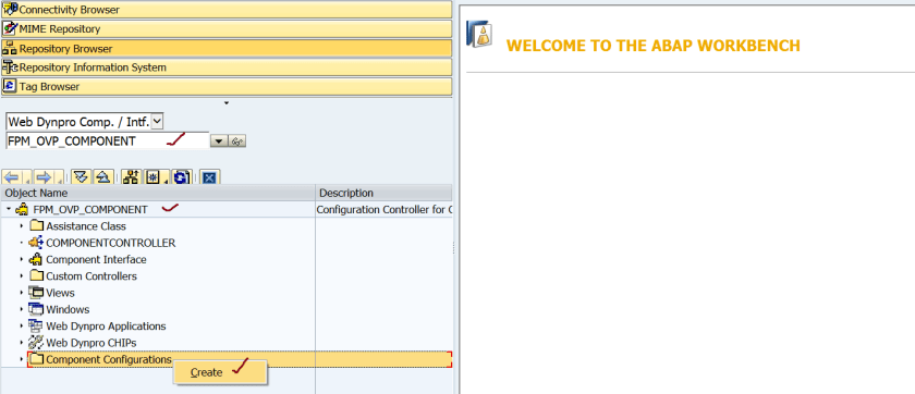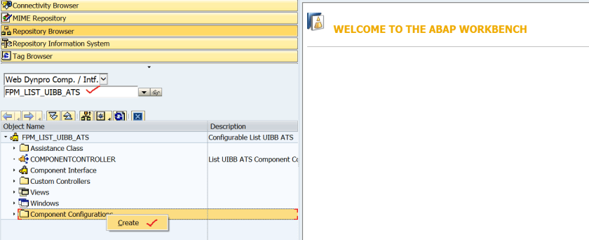 Step30. Go to SE80 and open the web dynpro component:  FPM_LIST_UIBB_ATS.  Right click on the Component Configuration and click on Create.