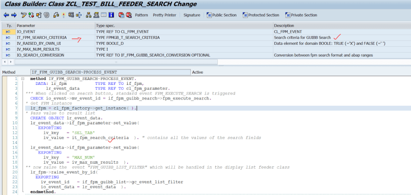 Step78.  Go to the feeder class of the search UIBB and open the Process_event method. All the search parameter provides in the search screen it would be available in IT_FPM_SEACRH_CRITERIA internal table as an importing parameter to this method. Set all the search parameters to the event data and at last trigger the LIST_FILTER which would be handled in the list uibb feeder class PROCESS_EVENT method.