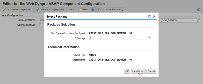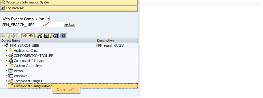 Step12. Now we have to create a component configuration for search UIBB. Go to Tx- SE80 and open the Web dynpro component: FPM_SEARCH_UIBB. Right click on the Component configuration and Create.