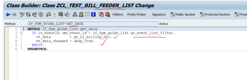 Step82. Go to the GET_DATA method of the list uibb feeder class and pass the global internal table which contains the search results to CT_DATA so that the result records will appear on the UI screen.