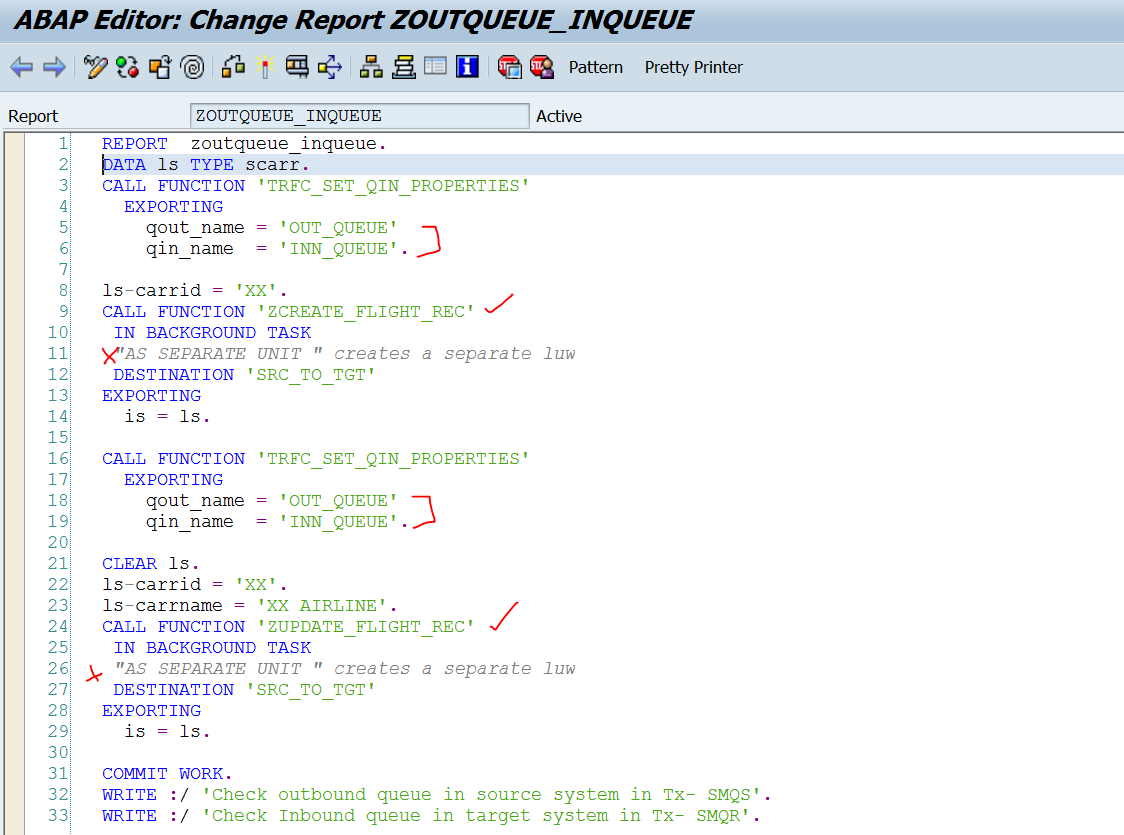 Step1. Here we have a program that uses a single queue and inside that we have two RFC FM calls and at last commit work happens so it creates a single TID- Transaction ID ( one luw) . Execute the program.