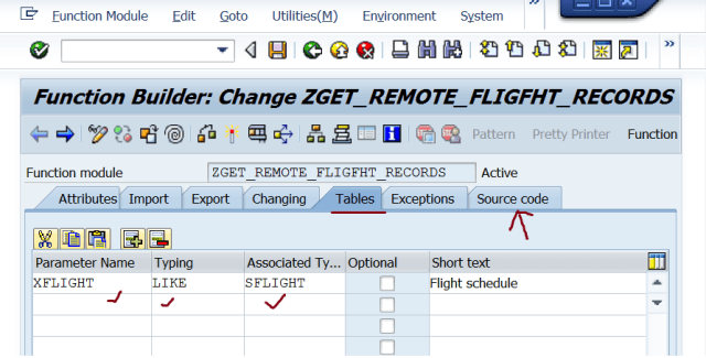 Step10. Provide the details parameters. Here we have to keep in mind all importing exporting , tables nad changing parameter should be pass by value . Go to the source code tab.