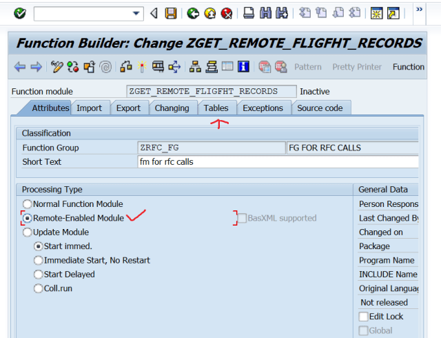 Step9. Choose RFC Enable Module radio button, other wise this FM we can’t call from our sender system. Click on Tables option.