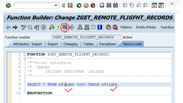 Step11. Provide the code. Here we need all the records from SFLIGHT table . Activate it. Click on the test button.