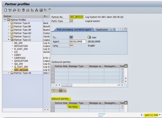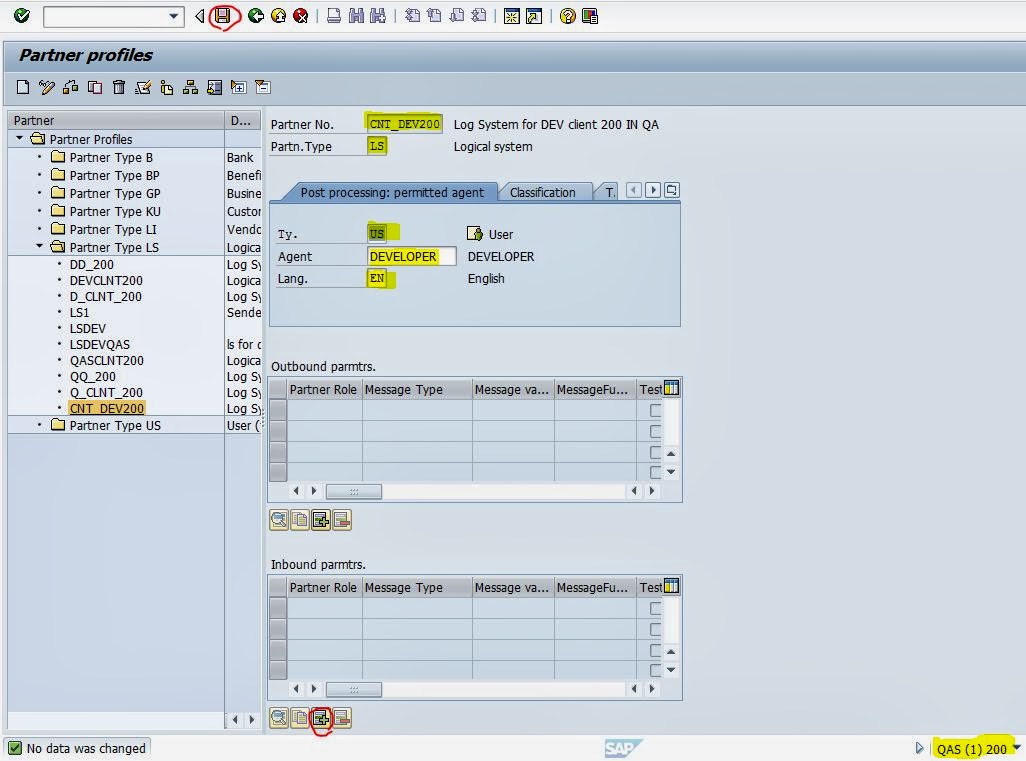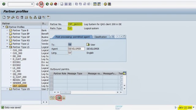 Step31. Provide the Partner name ‘CNT_QAS200’ , partner type as LS and click on Save button. Now click on the ADD button on the outbound parameter section.