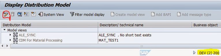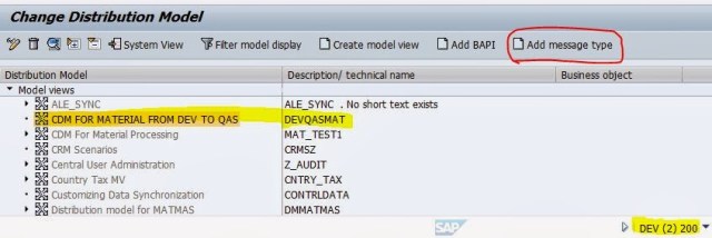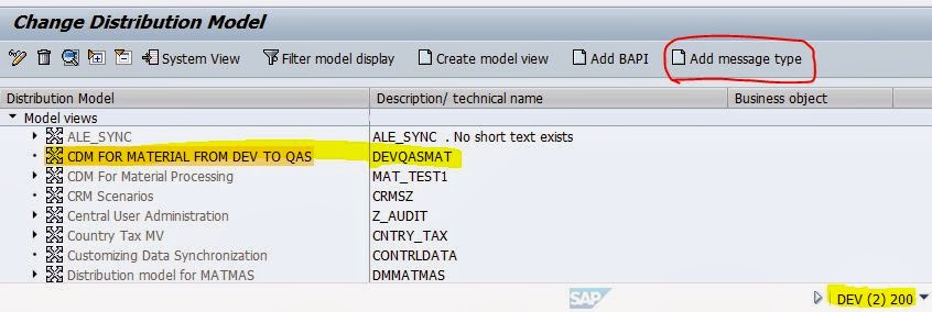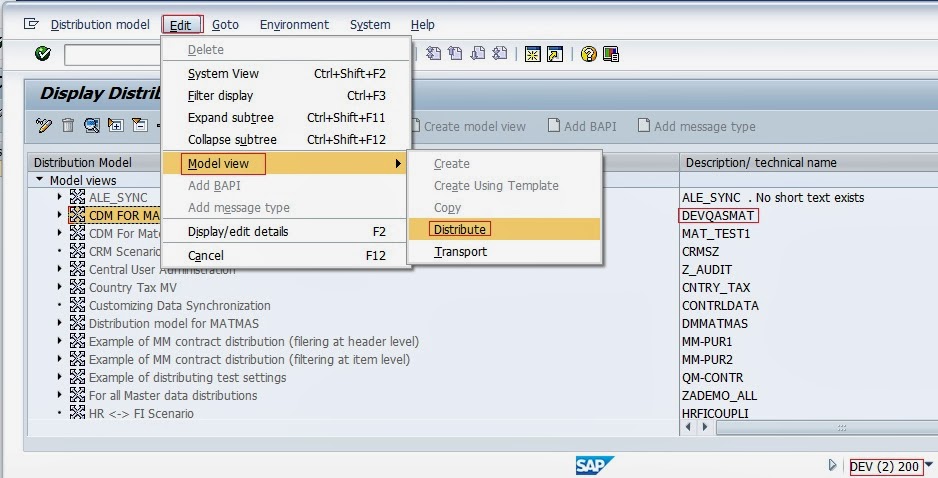 Step44. Now In BD64 transaction, distribute the distribution model ‘DEVQASMAT’ as per the highlighted path.