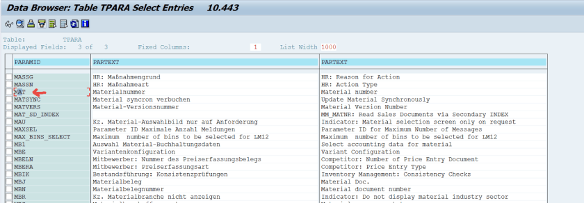 Open the table TPARA and here we can find Parameter Id – MAT.