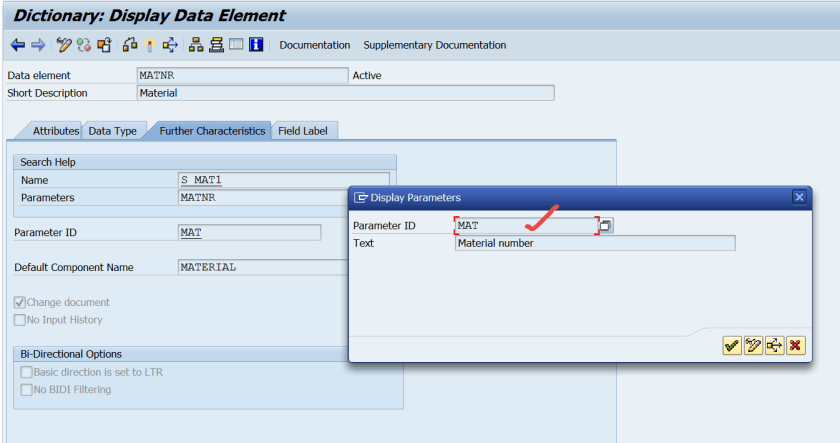 Open the data element MATNR. Here Parameter ID- MAT is used.