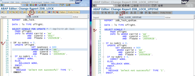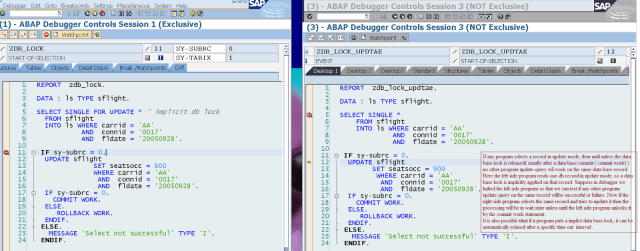 Step2. The left side program selects the record in update mode which puts an implicit database lock on the record. Halt the left side program at the specific debug point so that the lock will be remain there and we can test any other program update query on the same record. Run the second program and the right side program reads the same record as of the left side program and when the update query will run by the right side program on the same record, the update query execution will be in the processing mode until unless the left side program remove the implicit lock by a commit work or rollback work or time out interval.