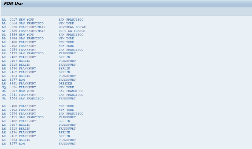 WRITE :/ <fs1>–carrid, <fs1>–connid, <fs1>–cityfrom, <fs1>–cityto.