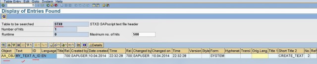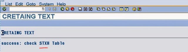 Step14. Create a report and use FM ‘CREATE_TEXT’ and use the above created Text Object and Text ID to store some message in the standard table ‘STXH’ & ‘STXL’.