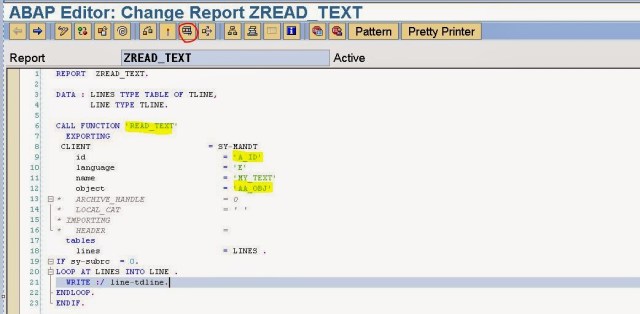 Step18. Use the FM ‘READ_TEXT’ to read the above created text from the standard sap script table.