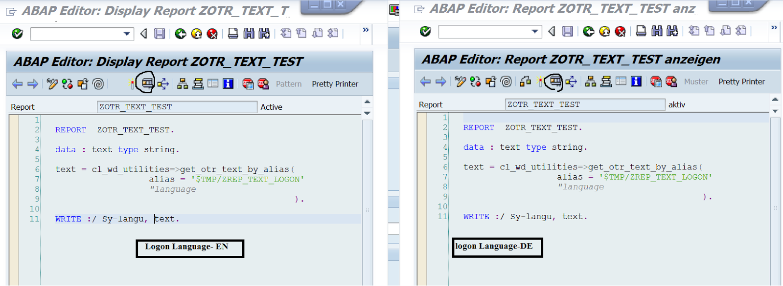Step11. Go to SE38(logon lang-EN) and create a report program. Th otr text can be accessed by its alias name by calling some standard class-method as shown. Open the program in another logon language as -DE. Execute the same program in different languages.