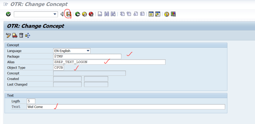 Step5. Maintain below details like package, alias name and object type & the Text – Wel Come. Save it.