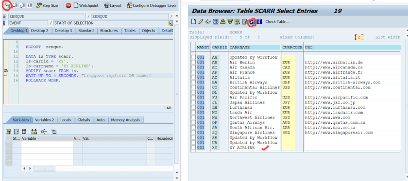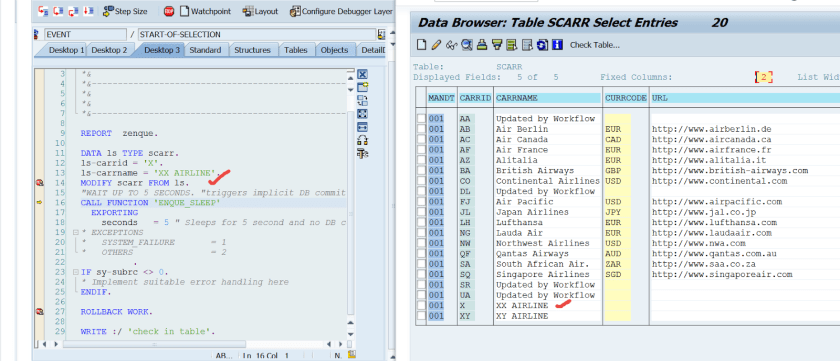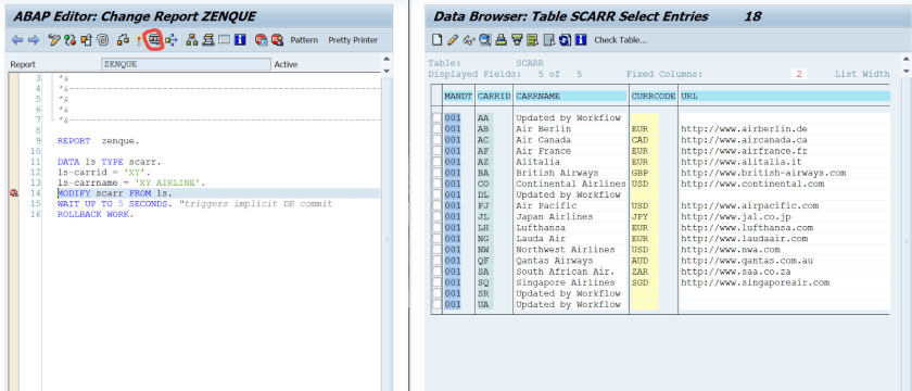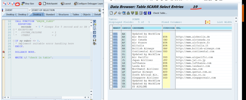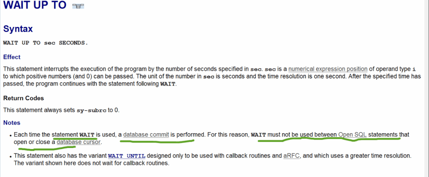 ABAP Command – WAIT UP TO … Secs holds the program processing for that seconds but it internally triggers a data babe commit which especially can’t be used when we have already opened some DB cursor. In such a situation ABAP provides some SLEEP function like JAVA by the Function Module : ENQUE_SLEEP which holds the program processing for some moment without any DB commit.