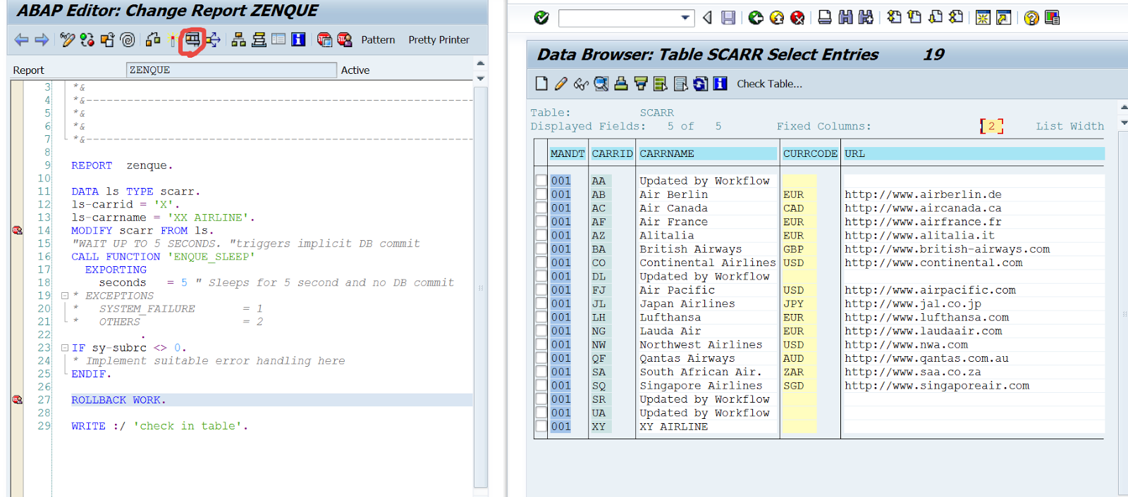 ABAP Command – WAIT UP TO … Secs holds the program processing for that seconds but it internally triggers a data babe commit which especially can’t be used when we have already opened some DB cursor. In such a situation ABAP provides some SLEEP function like JAVA by the Function Module : ENQUE_SLEEP which holds the program processing for some moment without any DB commit.