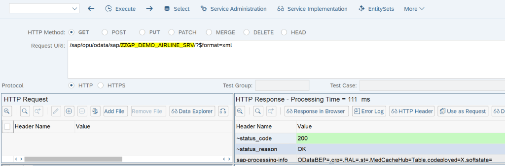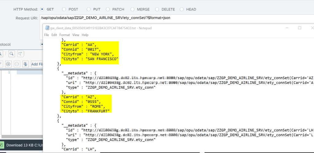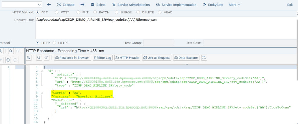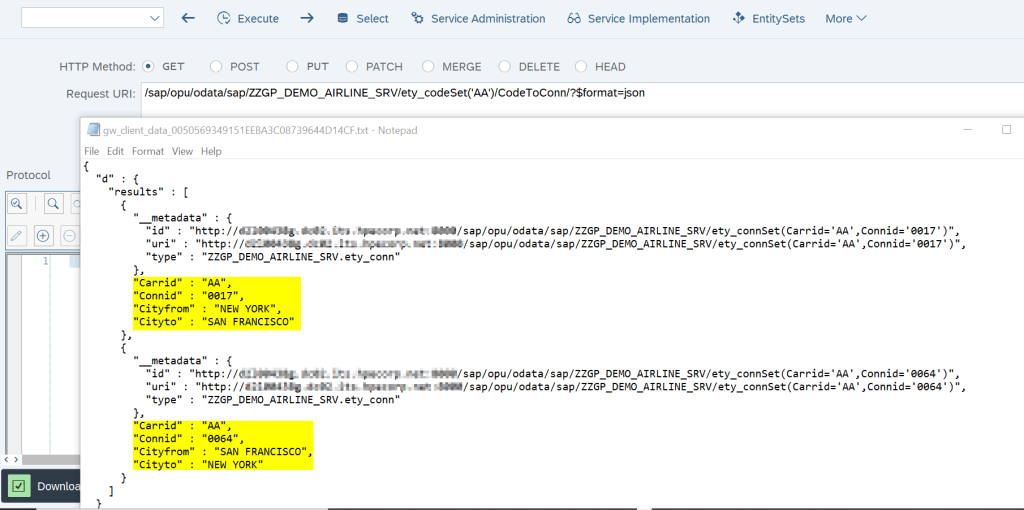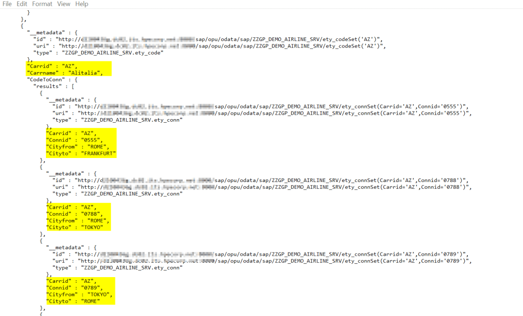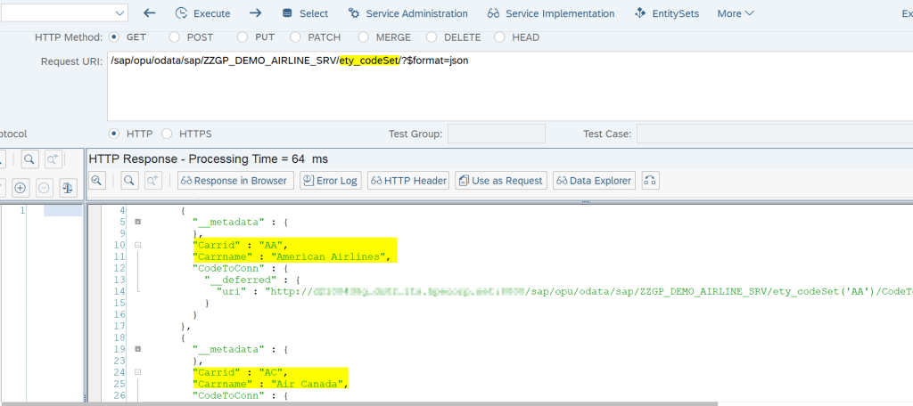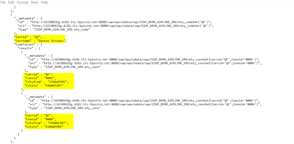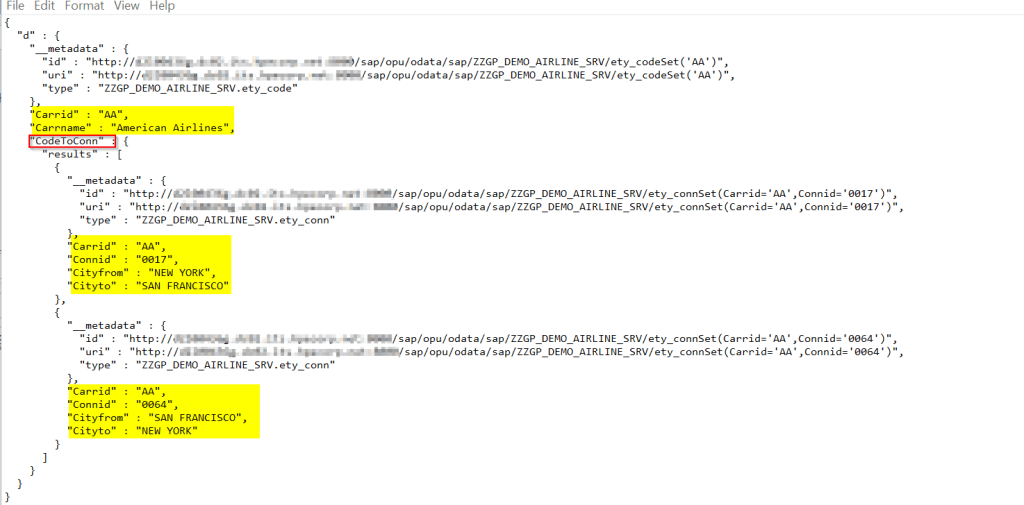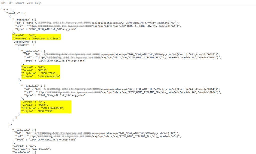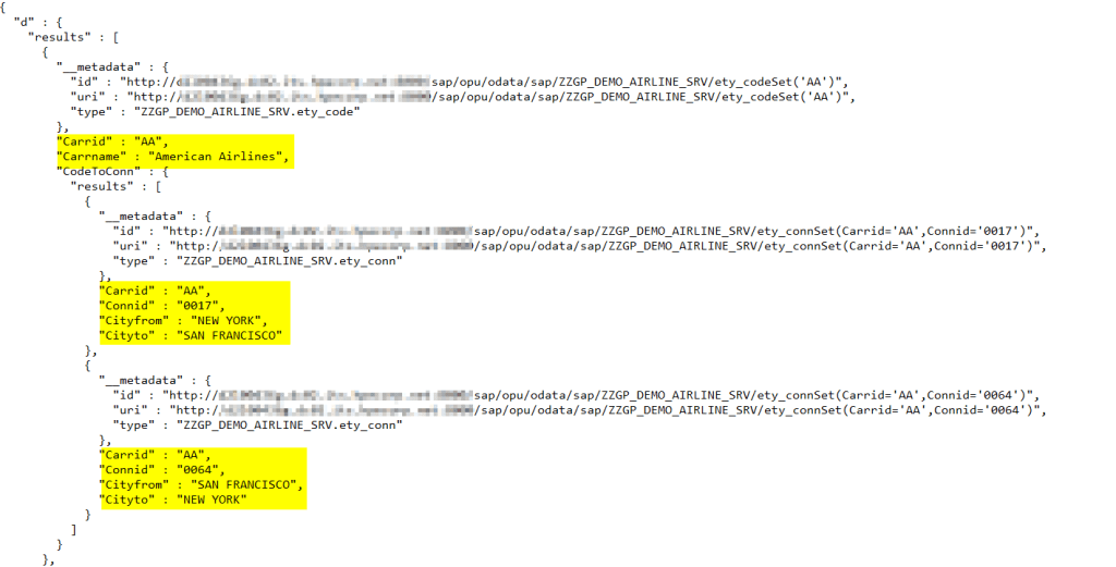 So lets test that. On the request URI provide the root entity set followed by the navigation path name. It brings the dependent/child set for the carrid = ‘AA’. It makes use of the get_entity and get_entityset method to fetch the result set.