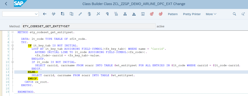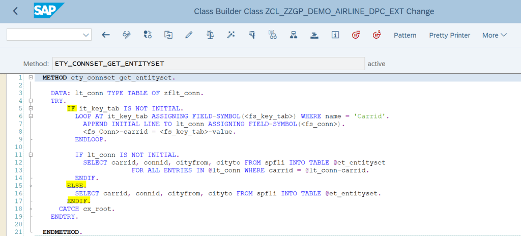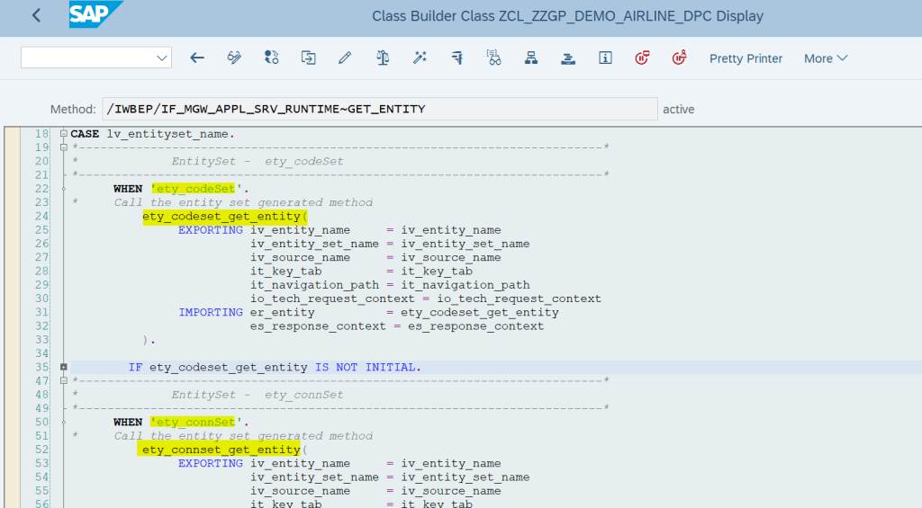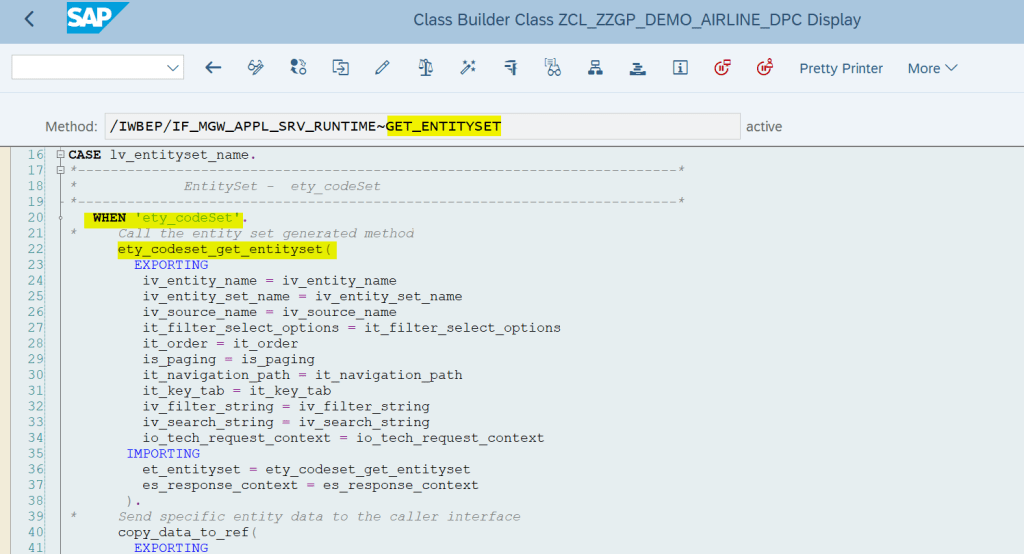 Now the time is to see the GET_ENTITYSET method of the DPC EXT and this is implemented in the super class DPC. These are autogenerated codes and nicely structured. Calls specific method depending on the entity set types.