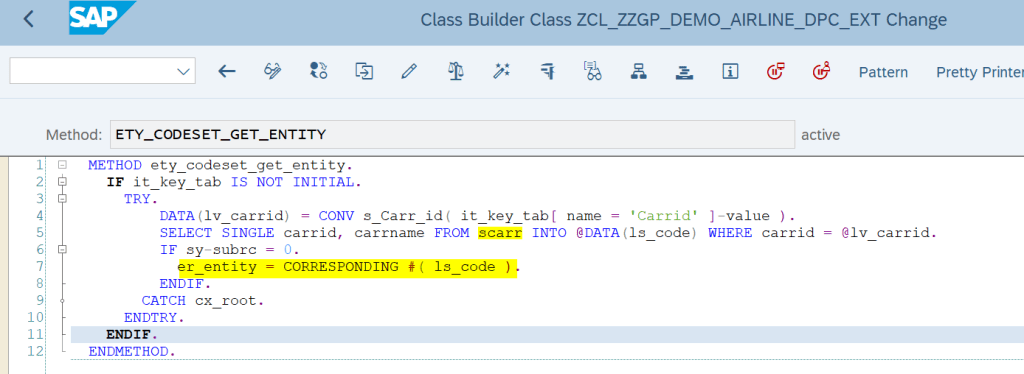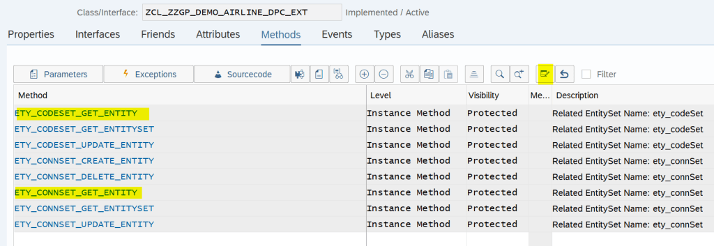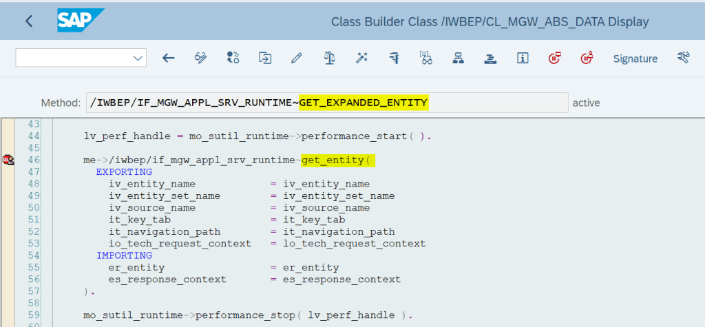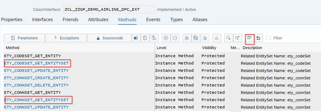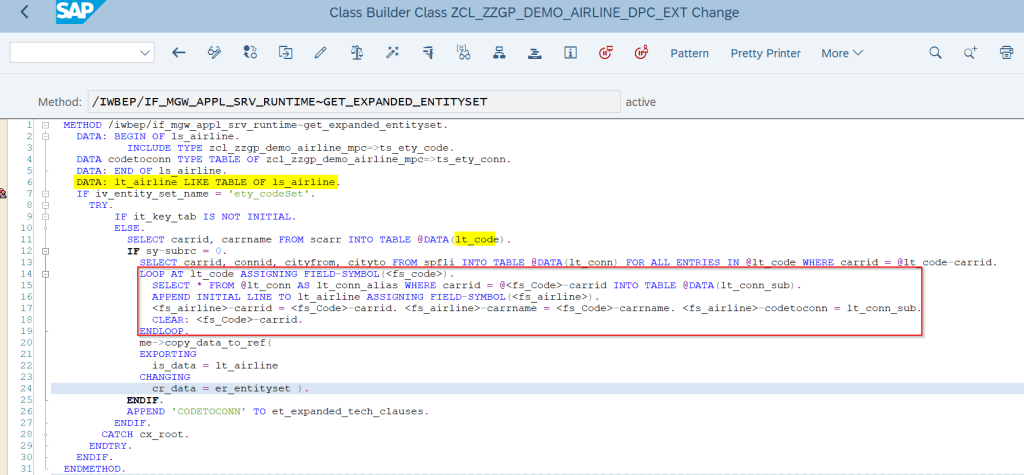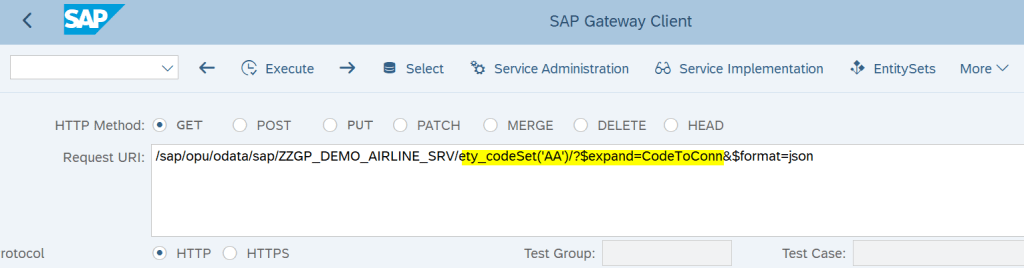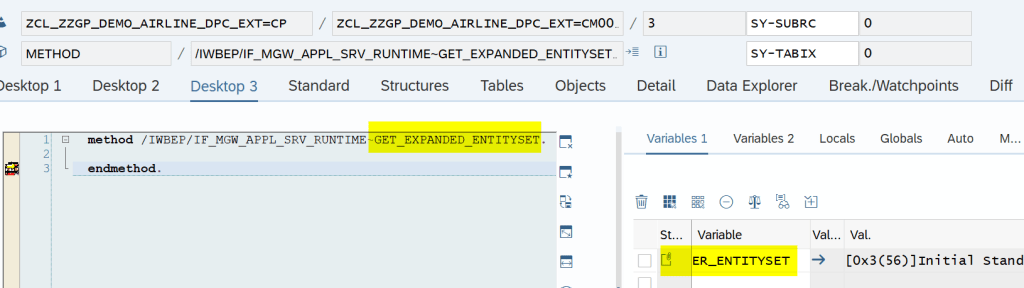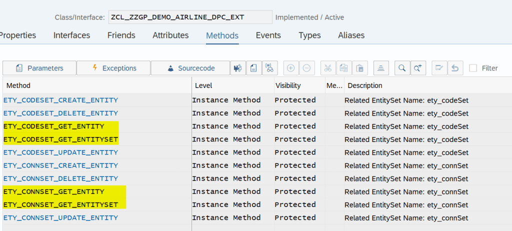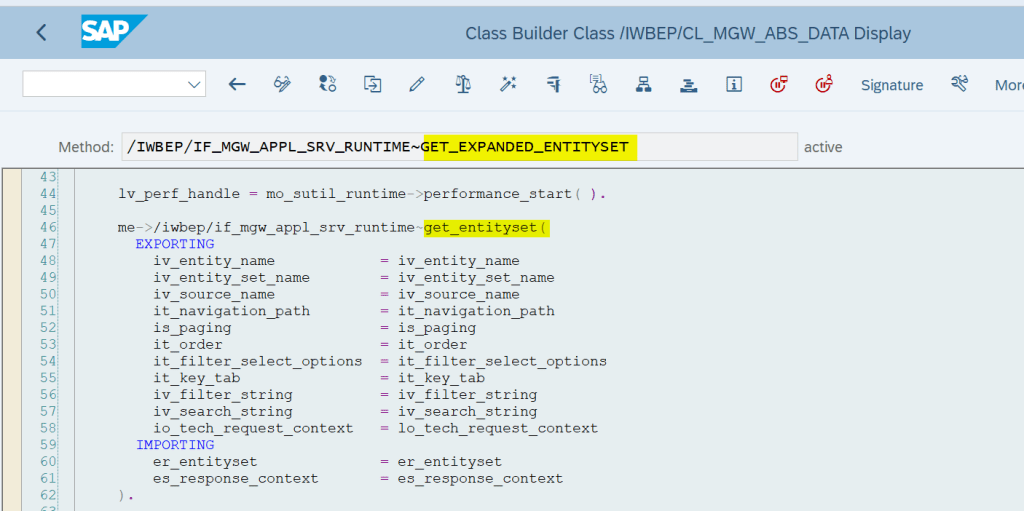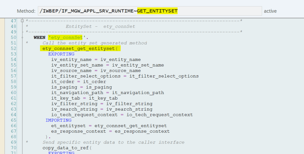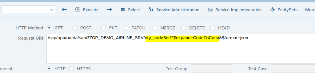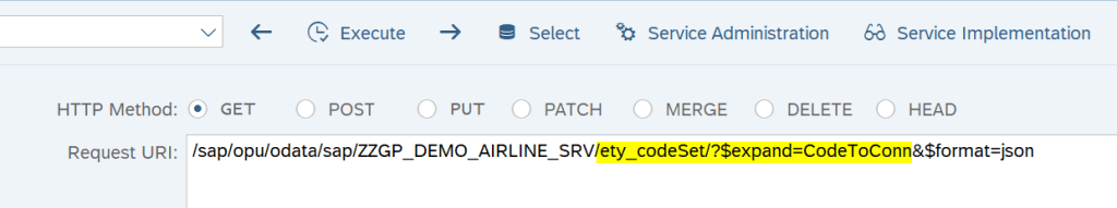 Request URI- ety_codeSet(‘AA’)/?$expand=CodeToConn – The call goes to GET_EXPANDED_ENTITY and from there is goes to GET_ENTITY to get the header part of deep structure. Then it goes to the GET_EXPANDED_ENTITYSET and then goes to the GET_ENTITYSET to get the item details.