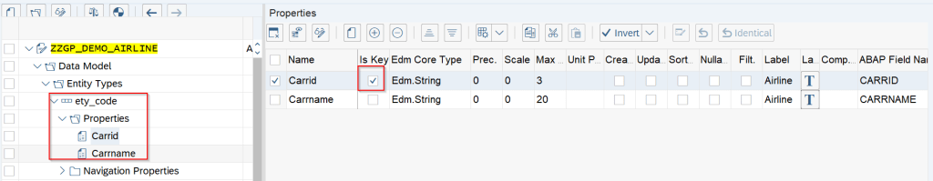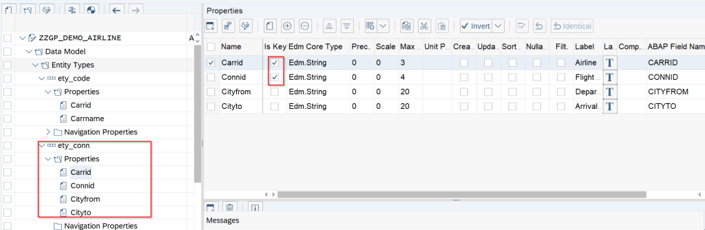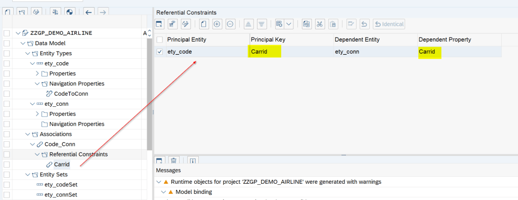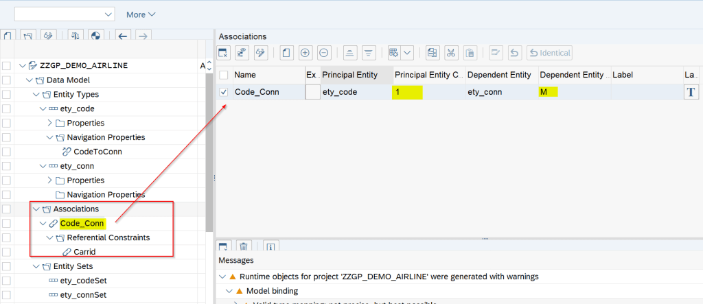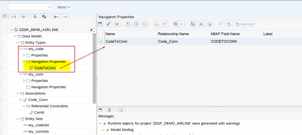 During the association also the navigation property [ CodeToConn] is created. Remember here the ABAP fieldname is CODETOCONN for the navigation. It will be used later.