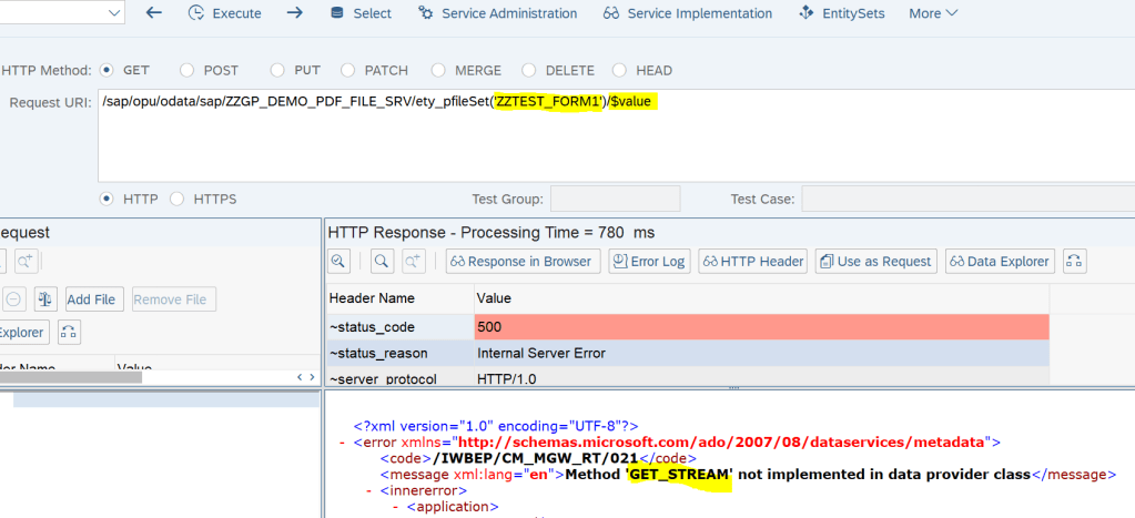 Lets provide the entity set name and pass the smartform name as the key and use addition- $value. As we can see it goes to the GET_STREAM method but it is not yet implemented.
