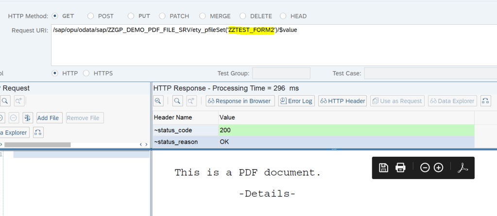 As we already registered the service( /IWFND/MAINT_SERVICE) ,Now test the service in the gateway client(Tx- /IWFND/GW_CLIENT ). The status looks good.