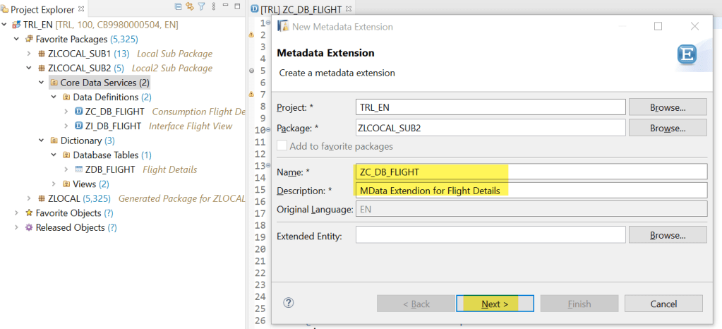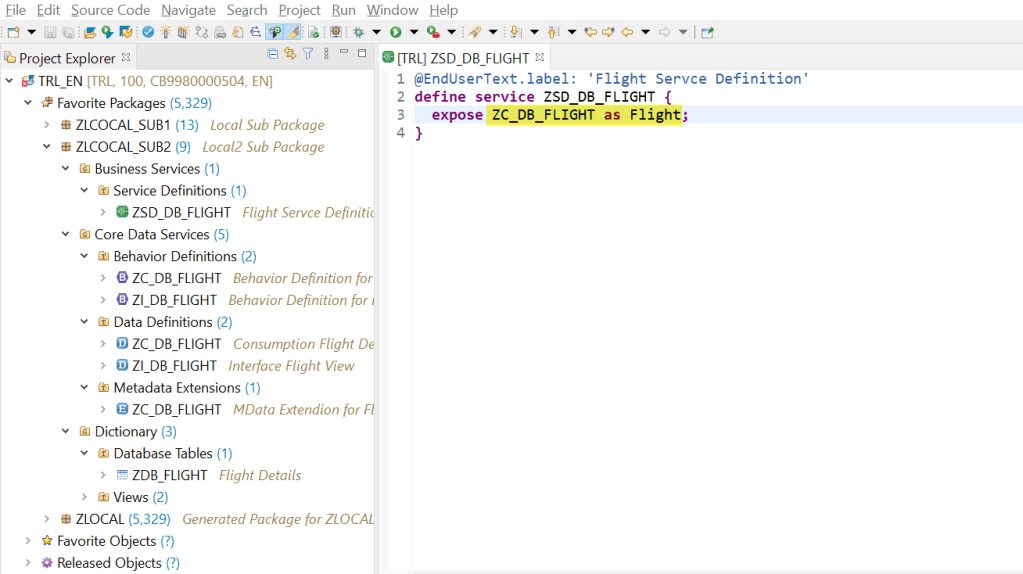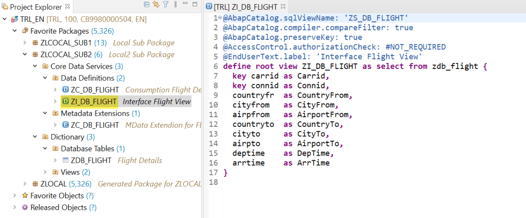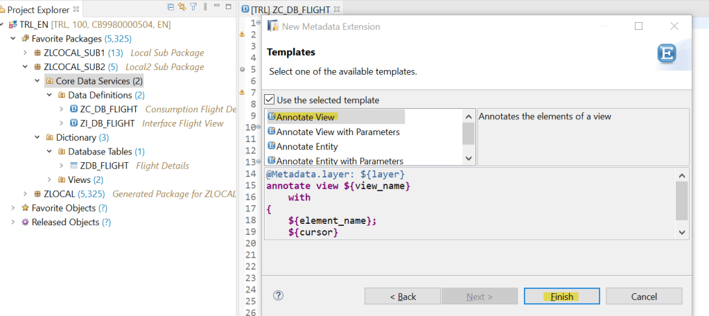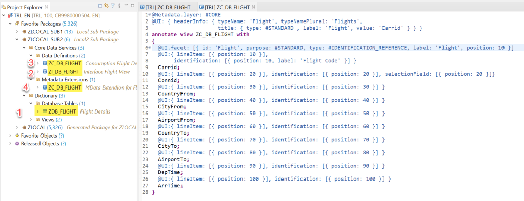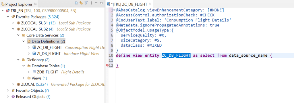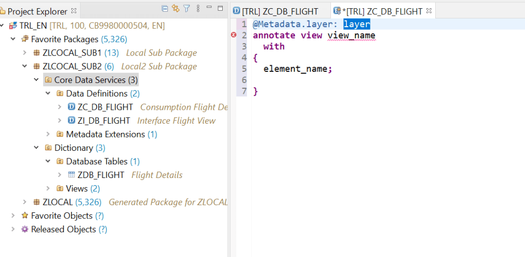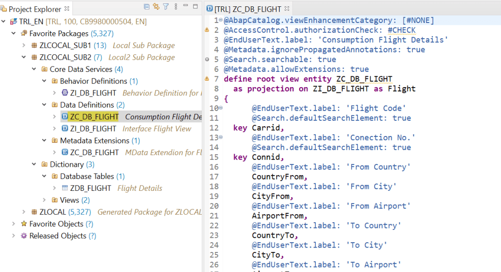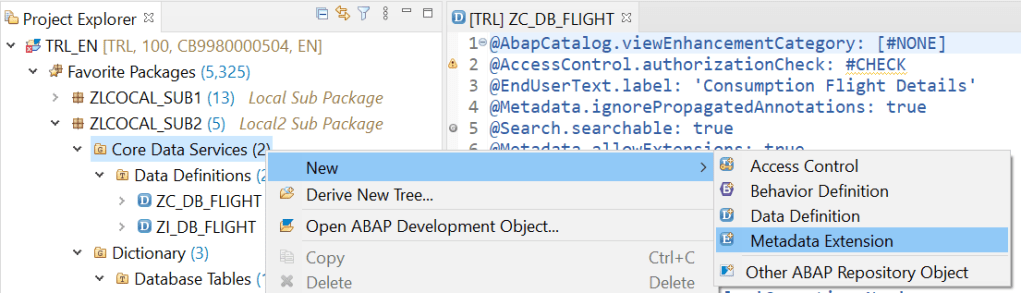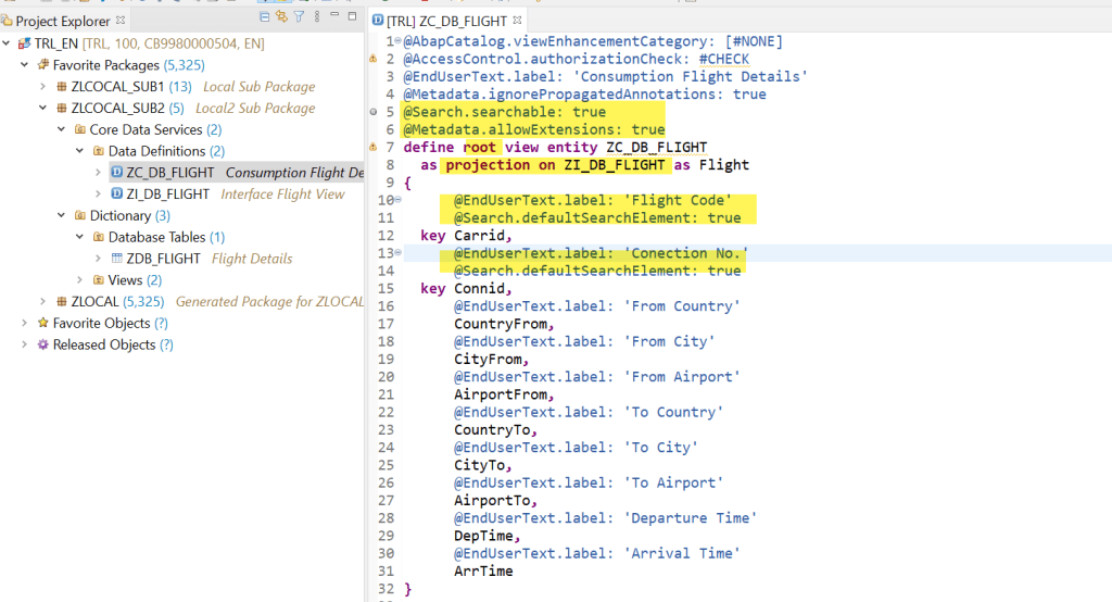 This is the consumption view which is a projection on the interface view. Here we added annotations such as Searchable and enduser text for each of the fields. In addition set allow meta data extension as true as in next we are going to define a meta data extension for our fiori UI.