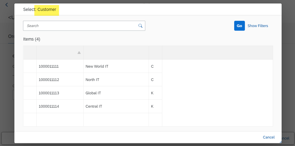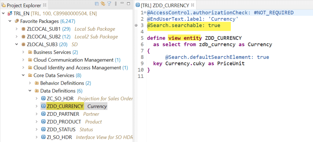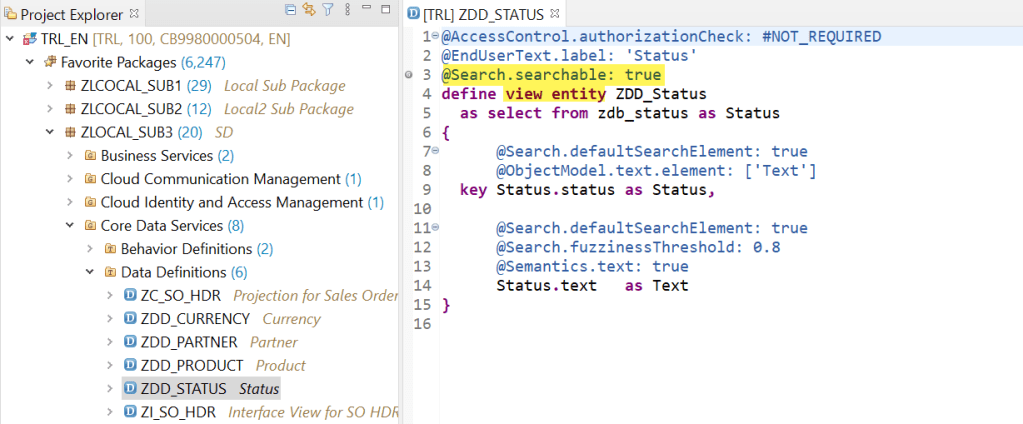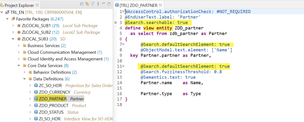 For the F4, lets create View entity for each of the tables created above. Most importantly the search is enabled. View entity for partner/customer.