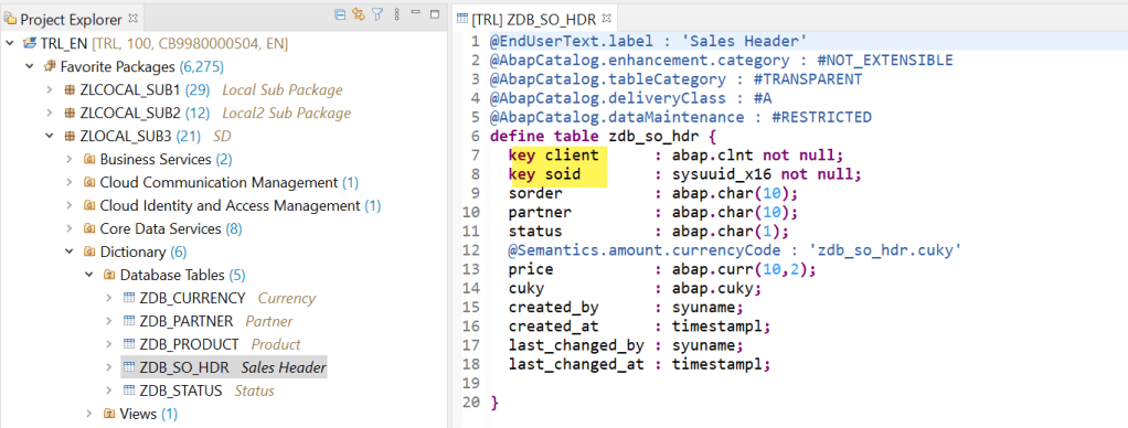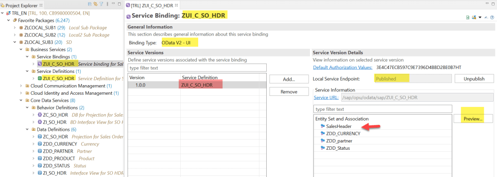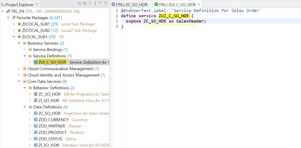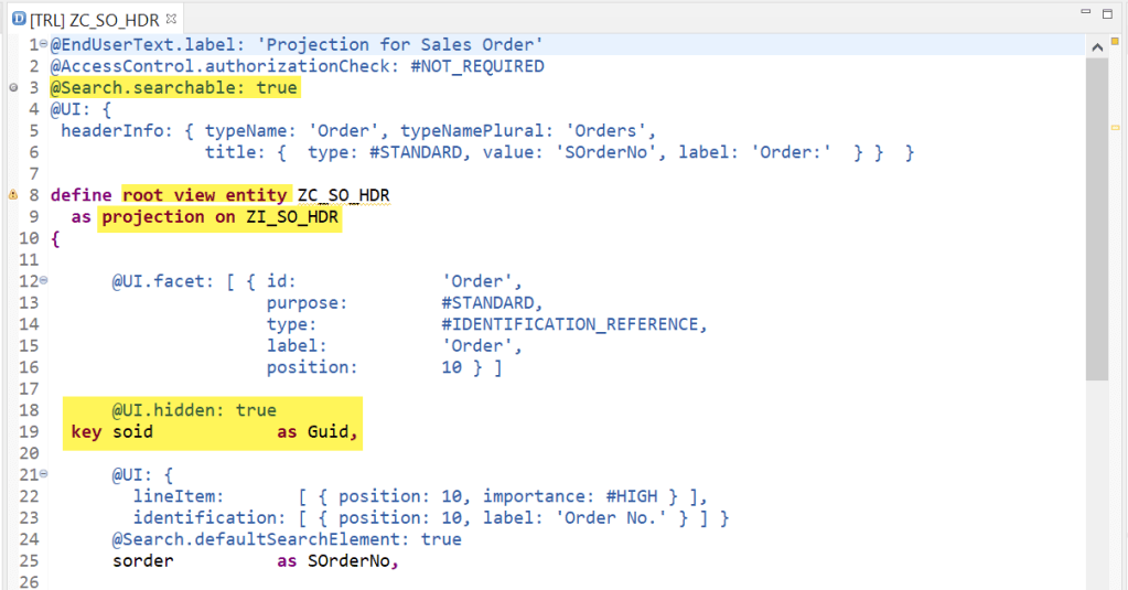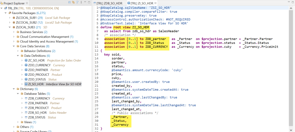 The CDS view for the sales order header table- Mae it ROOT view by adding ROOT keyword in the view and define the association to the partner, status and currency views.