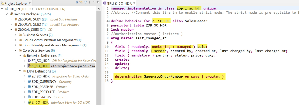 The behavior definition for the root view- Here few fields are marked as readonly and few are mandatory and for SOID field which is a GUID, the number generation is managed means the framework takes create of generating the same. We have also mentioned here one determination “GenerateOrderNumber” which will be triggered during the SAVE of the CREATE process. We also have a behavior implementation class not yet created but will create this class to handle the determination.