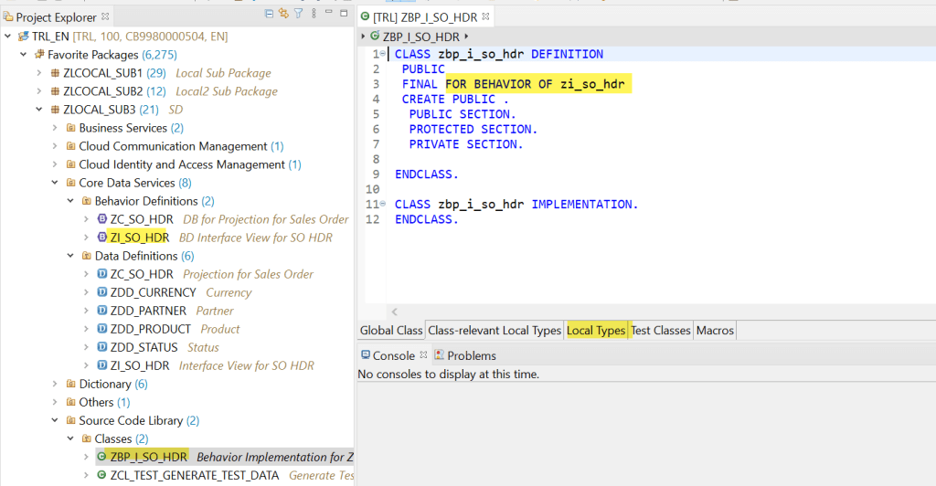 Here we have defined a local class that inherits property from cl_abap_behavior_handler. And we have a method that is called for the Determination mentioned in the view behavior definition.