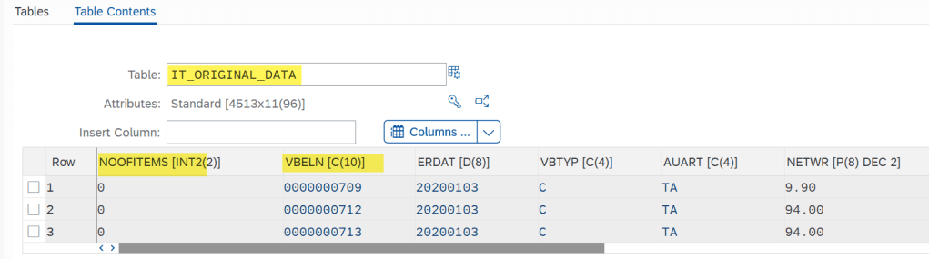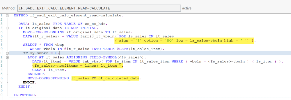 Let’s build our logic. Prepare a range table of sales order header and make selection on VBAP and then for each VBELN, get the no of lines and then we calculate our noofitems .
