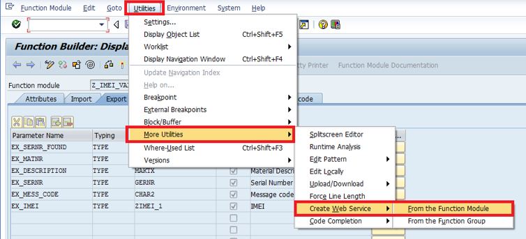 One RFC is created → Go to Utilities → More Utilities → Create Web Service → From Function Module