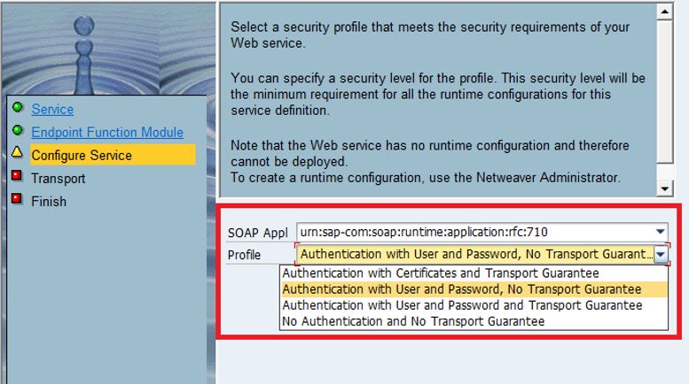 In below screen, if we will select ‘No Authentication and No Transport Guarantee’ then User ID and Password needs to be maintained in SOAMANAGER (Credentials are required to hit SAP System) and the Service will become open to all which is not advised. Here I have selected ‘Authentication with User ID and Password and Transport Guarantee’.